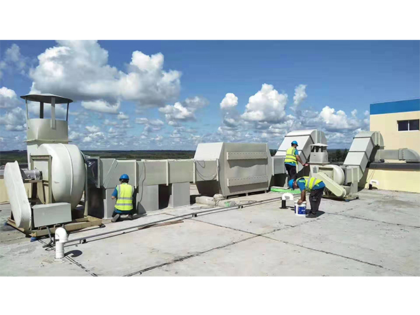 1、活性炭吸附装置,即主风管到达楼顶后连接活性炭吸附装置再连接离心风机,净化后的尾气排出去。