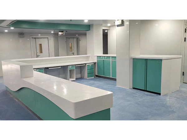 台面:可采用不锈钢,人造大理石,石英石,亚克力人造大理石等。人造石具有天然石粉、高性能树脂和天然色素,通过真空浇注或模压成型的矿物填充高分子复合材料(简称固体面材或固体板材,俗称“人造石”)。表面无气孔,具有极强的耐高温、耐污、耐酸碱、耐腐蚀、耐磨性能,使细菌无处滋生。对烧痕、灼痕极易修复,是一种非常卫生易清洁的材料,可塑性强,可以无缝拼接。材料环保,配套设计更人性化。这些都是选购者们对护士站工作台更加关注的地方。