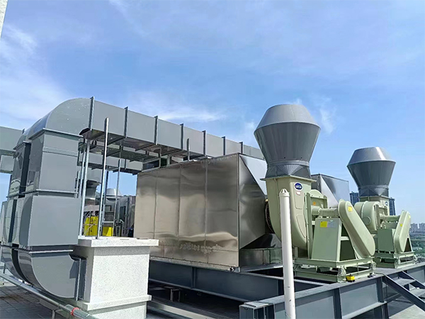 1、活性炭吸附装置,即主风管到达楼顶后连接活性炭吸附装置再连接离心风机,净化后的尾气排出去。